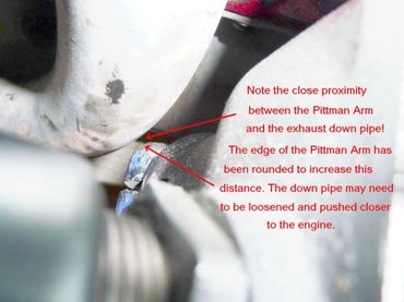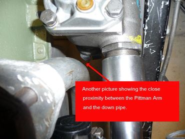 An alternative to this modification, if necessary, is to simply slide the steering box itself closer to the engine as this may provide the needed clearance. A word of caution to maintain enough clearance between the pitman arm and the down pipe when doing this. It’s usually recommended that the steering box be mounted as close to the frame as possible to give ample clearance between the pitman arm and the down pipe.