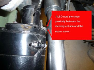 The last two pictures above show the steering column after clearance has been made and the exhaust excluder boot has been re-installed. It is important that the VW steering box be positioned as close to the frame rail as possible to add to clearance between the exhaust down pipe/pitman arm and between the steering column/starter motor. See the following three pictures.