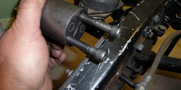 2. Drill the rivet holes out to 3/8 of an inch. On Bud’s car the holes were larger than 5/16″ and smaller than 3/8″ which is why he drilled them out to 3/8″. Be very careful doing this since the holes must be drilled very straight. If you are just building your car and have access to the inside of the frame this is the preferred direction to drill the holes. The VW steering bracket is supplied with two Allen head bolts.