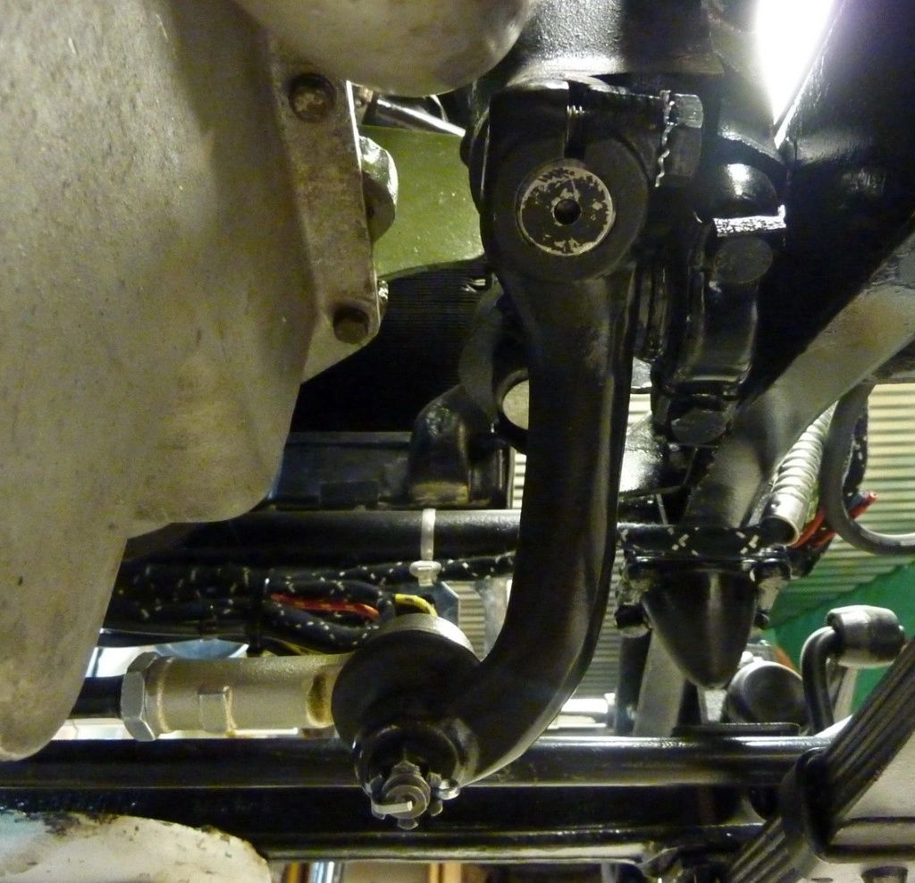7. Install the pitman arm/drag link from the right side of the car, between the spring and the frame, and thread into the TC rod end at the left side of the car. Remember that these are LEFT HAND THREADS.
