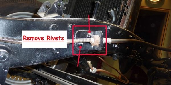 1. Remove the two rivets securing the brake line bracket. This can be done by drilling the heads of the rivets off or by grinding with a disk type electric grinder. How ever you do it, EXTREME care must be take here NOT TO DAMAGE THE BRAKE LINE. If you have an early car you will find that the bracket is secured to the frame with the rivets only. If you have a later car you will find that the bracket is welded and riveted to the car. I strongly recommend that you remove the brake line first. This will require that you re-bleed the brake when the project is completed, but it makes the removal of the rivets and drilling of the holes much easier and safer.