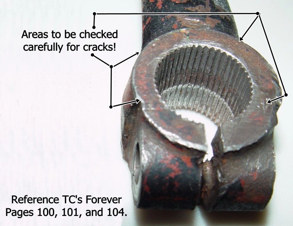 It is also worthwhile to remember that the BC Pitman Arm has been known to crack where it clamps onto the sector shaft. Please note with this picture, that Pages 100 and 101 suggest that cracks can occur opposite the pinch bolt. This refers to the two points in the upper portion of the picture. I personally consider the two points in the lower portion of the picture to also be potential points for cracks.